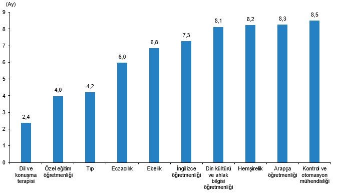 Lisans mezunlarında ilk iş bulma süresi ortalama 13,9 ay olurken ön lisans mezunlarında bu ortalama 15,3 ay olarak ölçülmüştür. Lisans mezunlarında ilk iş bulma süresi en kısa olan meslekler 2,4 ay ile dil ve konuşma terapisi birinci sırada yer almaktadır. Bunu sırasıyla özel eğitim öğretmenliği, tıp, eczacılık ve ebelik takip etmiştir.