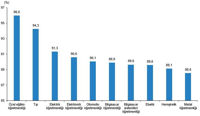 Eğitimi lisans seviyesinde olup en yüksek istihdam oranına sahip olan bölüm %96 ile özel eğitim öğretmenliği olurken bunu sırasıyla %94,3 ile tıp, %91,3 ile elektrik öğretmenliği, %90,6 ile elektronik öğretmenliği ve %90,1 ile de otomotiv öğretmenliği takip etmektedir.