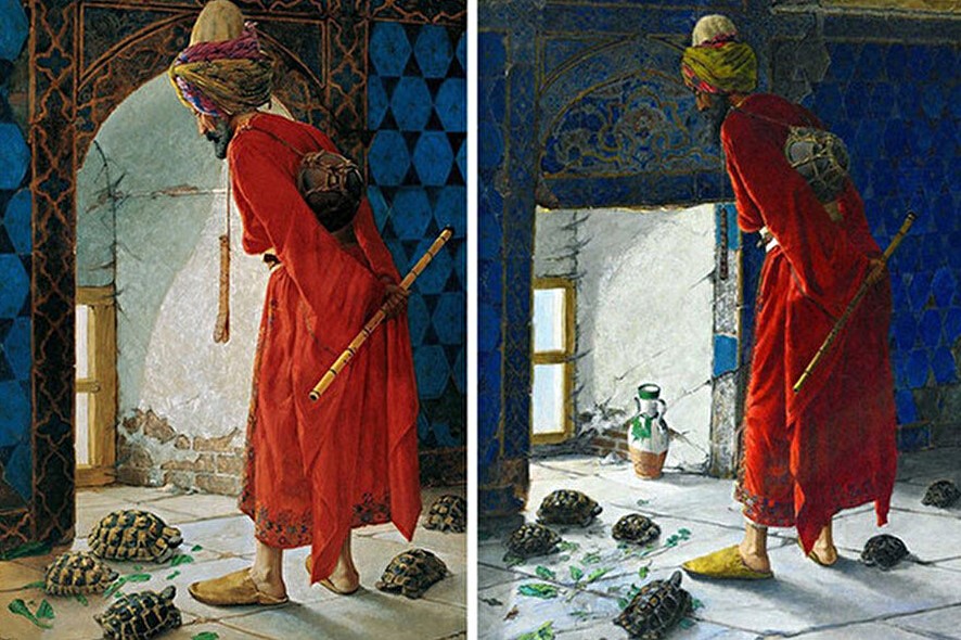 Kaplumbağa terbiyecisinin iki farklı versiyonu olduğunu söylemiştik. İşte burada da yine gizemler ve iki resim arasındaki farklar bulunmaktadır. Şimdi o farkların şifresine bakalım.